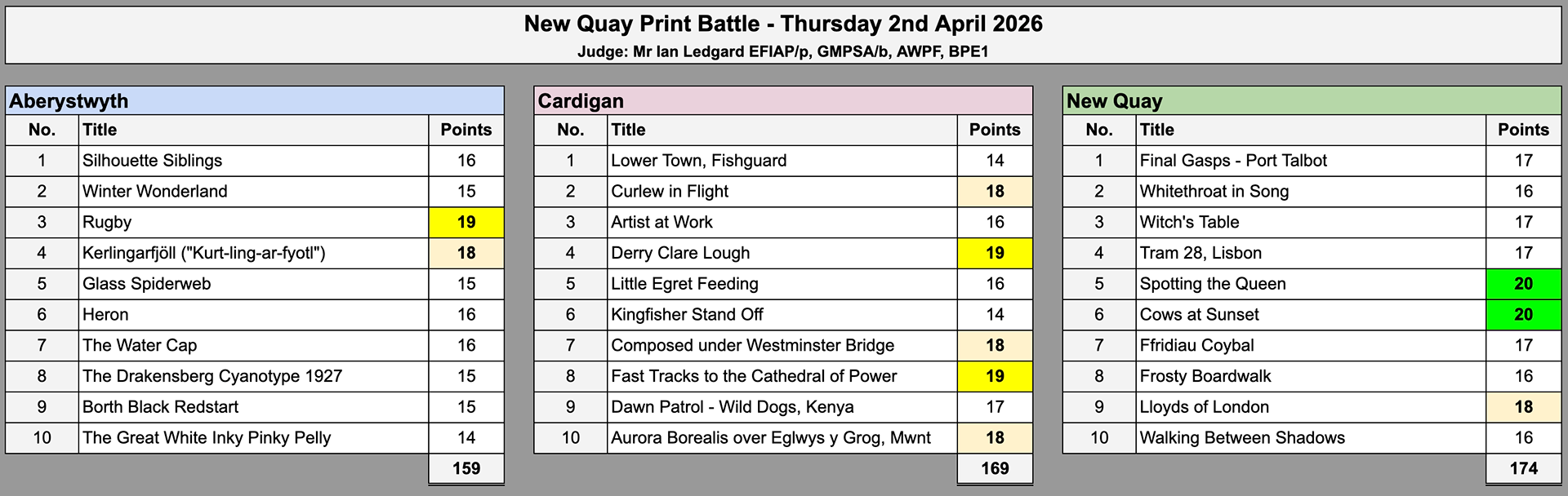 Images selected by the Selection Committee for the Cardigan Battle, with scores awarded at the competition: