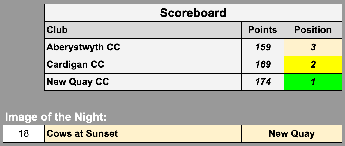 Each club to submit 10 images (jpegs) at a maximum size of 1600 x 1200 pixels. All images should fall into "Humanity in Action" or "The Wild World". Four clubs are participating: Aberystwyth, Carmarthen, New Quay and Cardigan.